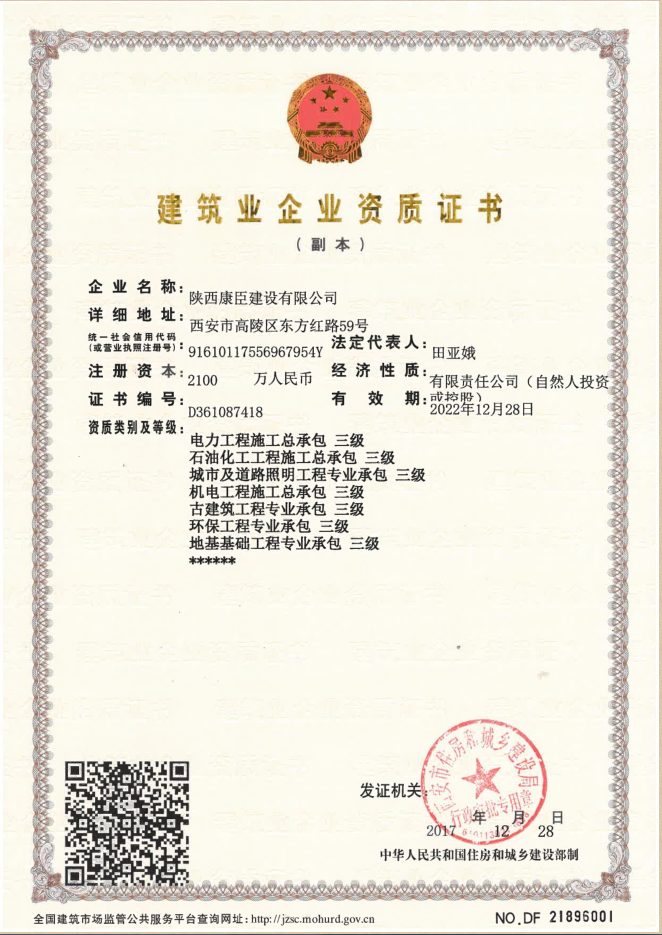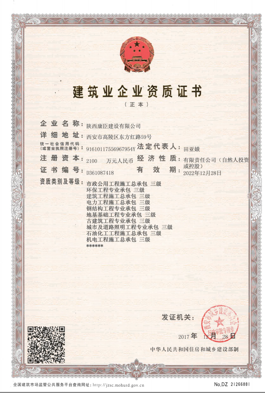 陜西康臣建設(shè)有限公司(簡(jiǎn)稱康臣建設(shè))始建于2010年6月,注冊(cè)資金2100萬元整。公司是從事市政公用工程、房屋建筑工程、城市及道路照明工程、電力工程、石油化工工程為主的企業(yè),具有建筑工程施工總承包二級(jí)、市政公用工程施工總承包二級(jí)、鋼結(jié)構(gòu)工程施工專業(yè)承包二級(jí)、城市及道路照明工程專業(yè)承包、電力工程施工總承包、石油化工工程施工總承包、環(huán)保工程專業(yè)承包、機(jī)電工程施工總承包、地基基礎(chǔ)工程專業(yè)...more+